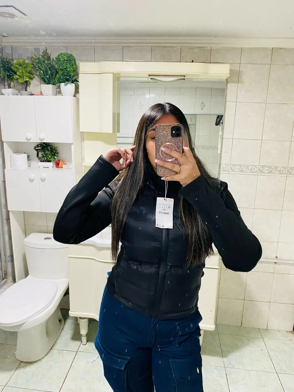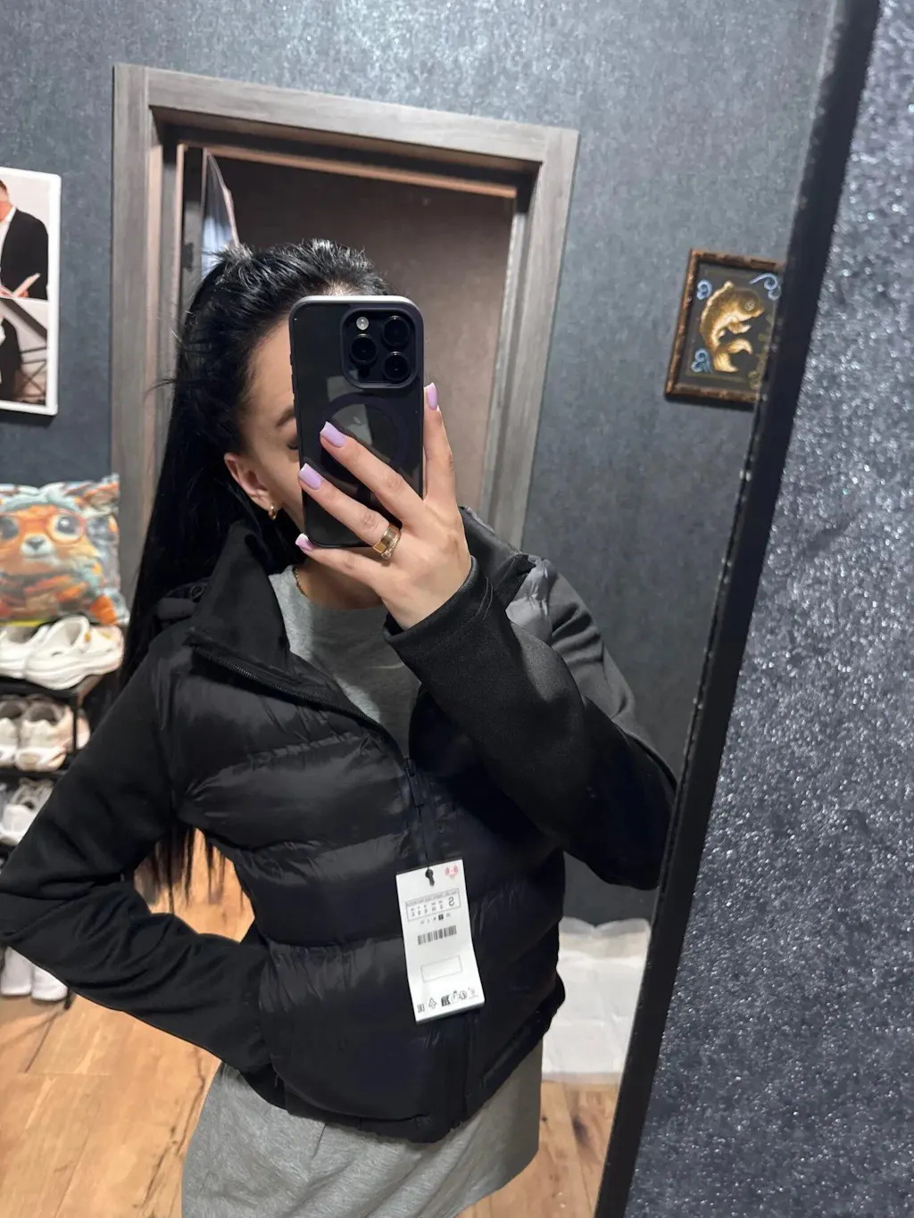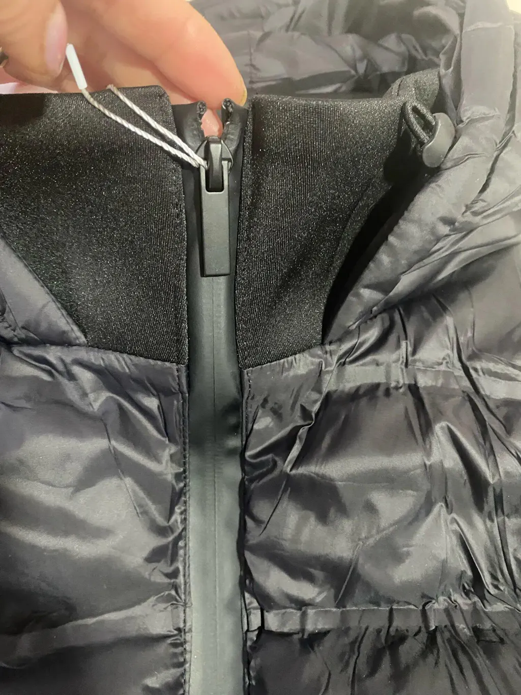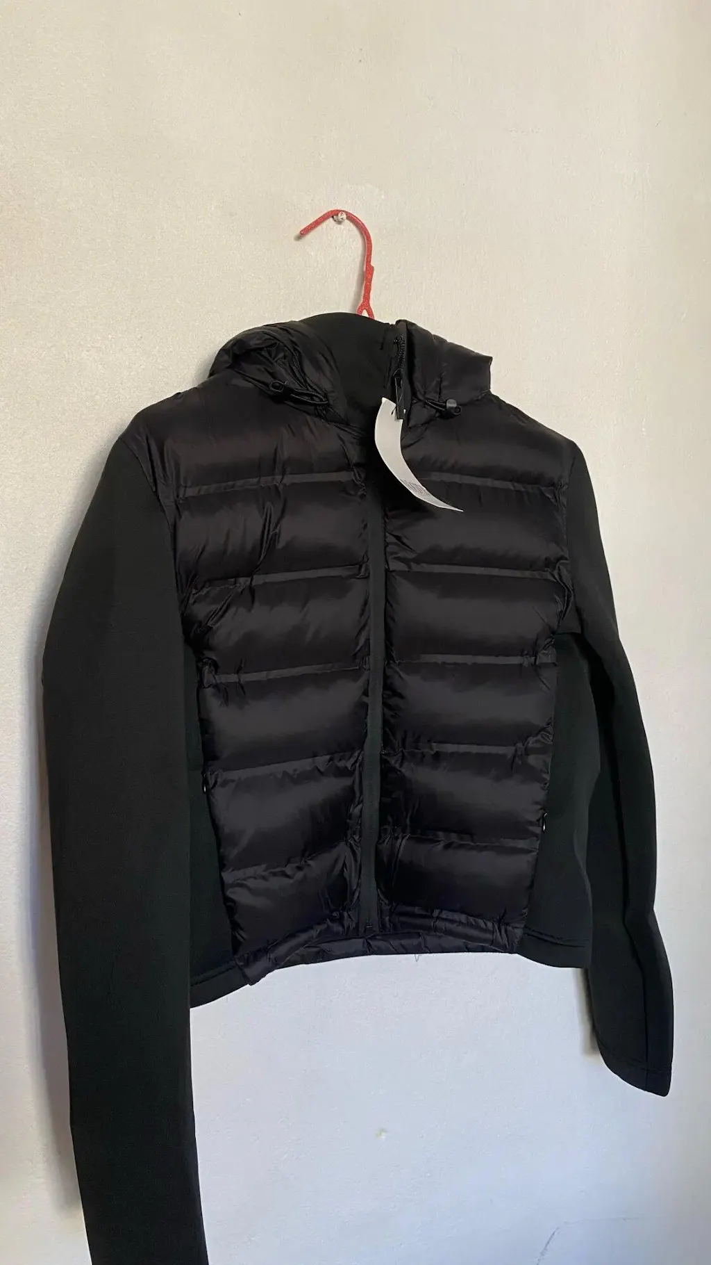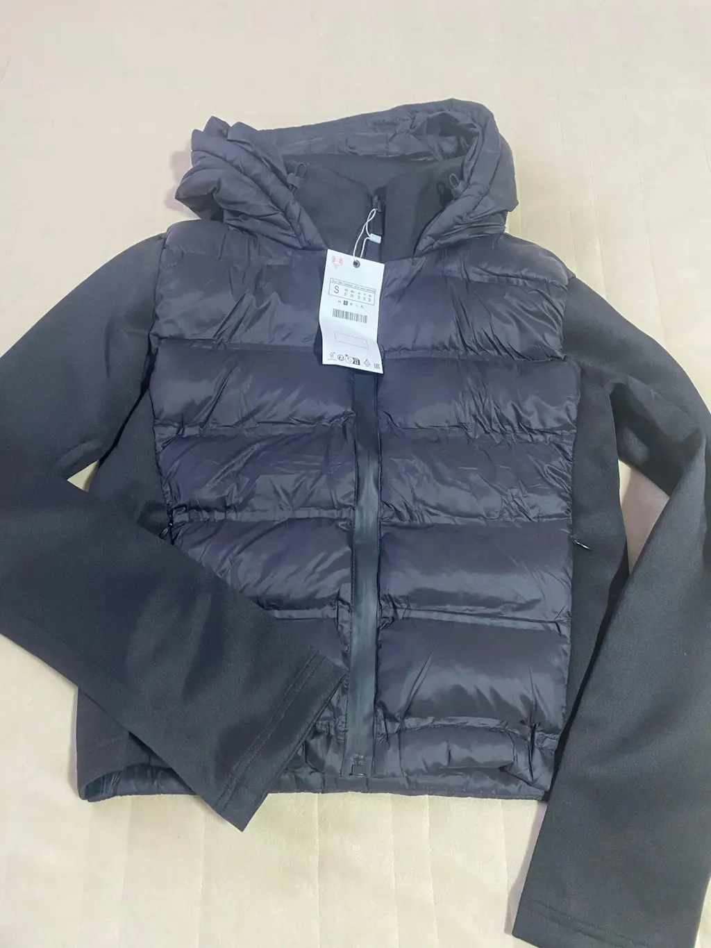 As mangas longas em tecido sintético criam um contraste moderno, enquanto os bolsos laterais com zíper oculto na costura garantem praticidade com um acabamento discreto. O zíper frontal termosselado reforça o visual contemporâneo da peça.